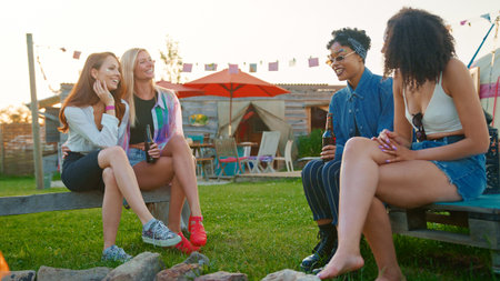 Group Of Female Friends At Music Festival Sitting Outside By Fire And Drinking Beer