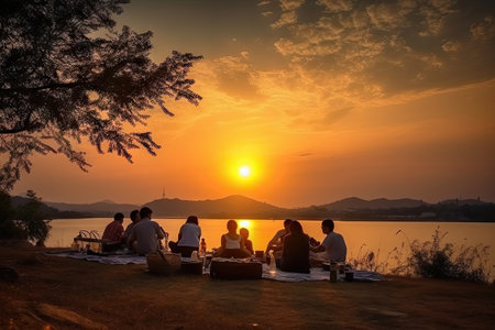 picnic with view of the sunset, people enjoying a moment of tranquility and beauty, created with generative ai