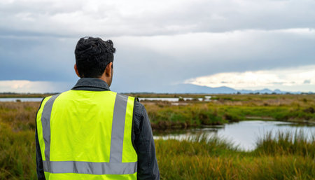 Researcher back view in safety vest near wetland overcast gradient field scene with generous copy space environmental science and conservation editorial