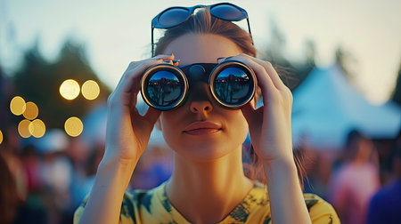 Stylish woman in sunglasses using binoculars at an outdoor event, scanning the crowd.