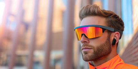 Futuristic Urban Explorer: Man with Augmented Reality Overlay in Winter Cityscape