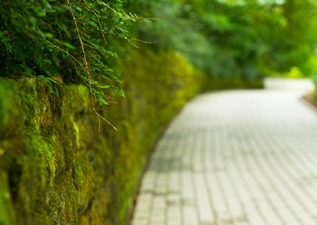 blur scene of small alley along wall in community area of Bangkok, Thailand. selective focus point, shallow depth of field.