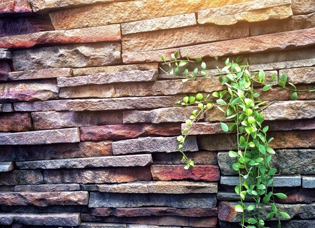 Natural stone bricks as a decoration on a wall with a green plants. Natural stone wall texture. The walls are made of stones or marbles. Decoration for the walls or febces.