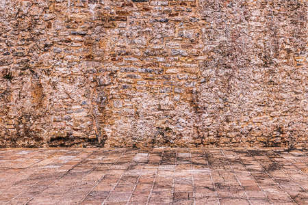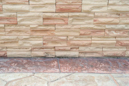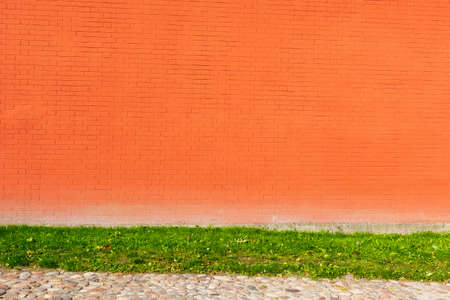 Tilted orange bricks wall texture with grass and sidewalk background. Small stones structure wallpaper. Outside stone wall surface, vintage grunge stonework. Exterior of tiled brickwork with copyspace