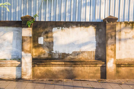 old weathered rustic concrete wall and fence along sidewalk with rough white paint, in front of metal sheet construction fence