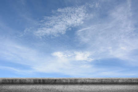 Perspective view of empty concrete surface in front of tree tops background. Useful as mock-up template, displayed product montage, backdrop. Copy-space for text is on top.