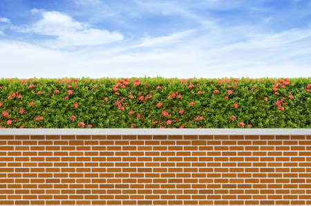 Vibrant background with a red brick wall, green grass and wooden flooring