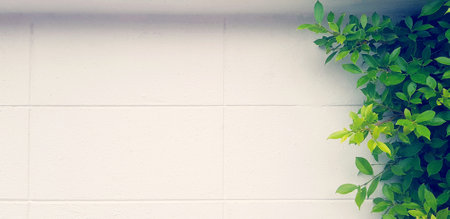 Green leaves plant with on white wall background with copy space on left in vintage tone filter. Leaf on concrete wallpaper.