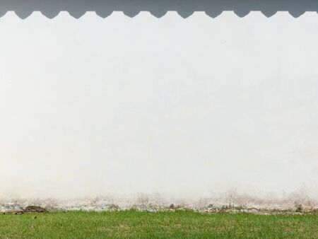 Urban grungy gray concrete wall with green grass. Grunge vintage background of green grass and concrete texture.