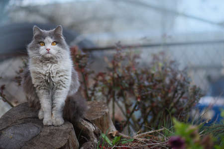 Portrait of a fluffy gray cat with yellow eyes in nature and looks around in the spring garden