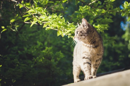 Adorable brown color domestic cat sitting and looking somewhere on fence of the house.