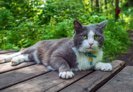 Cat is laying in a collar with a gps-tracker on a forest boardwalk.