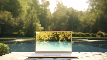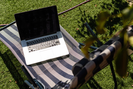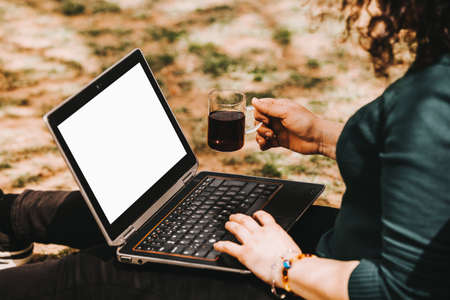 Laptop outside concept. Empty copy space, blank screen mockup. Soft focus laptop in nature background. Ecology travel and work outside office concept.