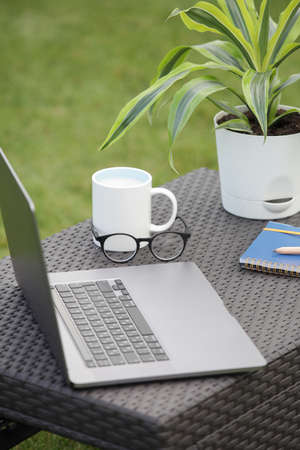 Laptop on the garden, close-up.