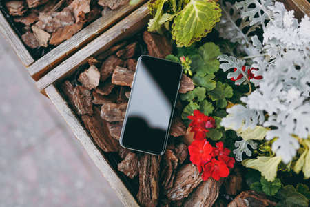 Close up mobile phone with blank empty screen on pieces of brown wood red flowers. Nature texture background. Design concept. Copy space, mock up sample. Advertising area. Overhead top view mockup