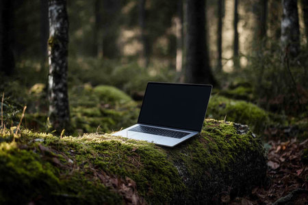 Distance job concept. Laptop in a mossy green forest. Ecology travel and work outside office concept.AI generated