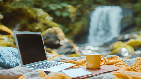 Laptop, coffee cup and notebook on the background of a beautiful waterfall.