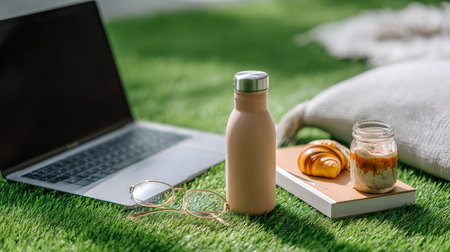 Laptop, drink and snack on green grass with pillow