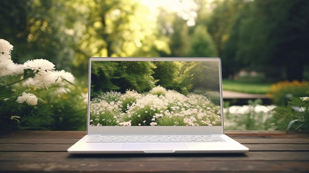 Laptop with blank screen on wooden table, green garden background