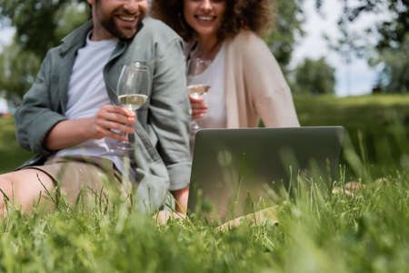 cropped view of happy couple holding glasses of wine while watching movie on laptop outside