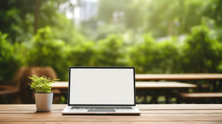 Laptop computer notebook white screen on wooden table at park outdoor