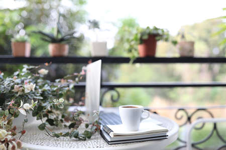 Laptop side view white mock and coffee cup with notebooks on white table outdoor