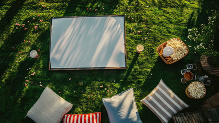 A picnic blanket is spread out on a vibrant green lawn surrounded by tall trees, shrubs, and colorful flowers, creating a picturesque tableau for a relaxing outdoor event AIG50