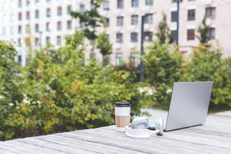 laptop, wireless headphones takeaway coffee cup on wooden table outdoors with green bushes residential building, concept of remote work, freelance, digital lifestyle productivity in urban environment