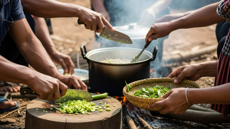 A hand stirring a vibrant vegetable stew in a cast iron pot over a campfire, surrounded by nature. This scene captures the essence of outdoor cooking and communal sharing of a delicious meal.