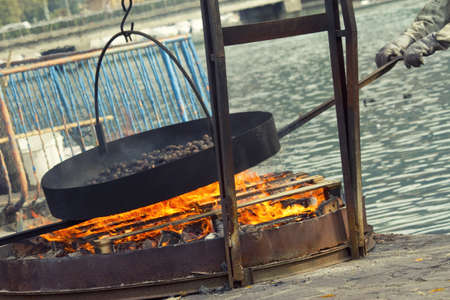 A large frying pan is heated for cooking. Delicious food at the festival.Field kitchen at the hearth.