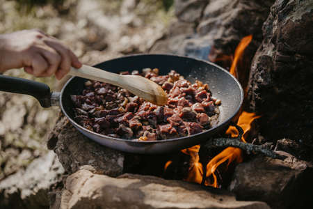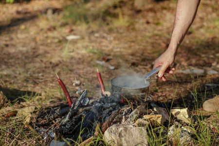 Pot with meat stew, on a fire bonfire in a tourist camp in a wild forest.