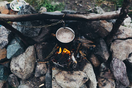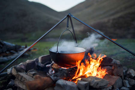 Evening dinner porridge at the bonfire, close up view, Altai, Russian Federation