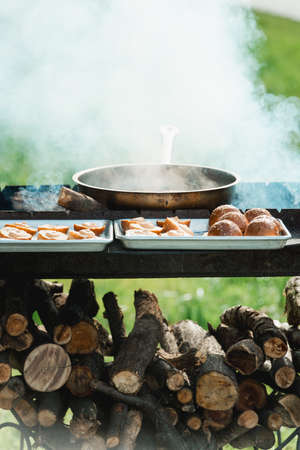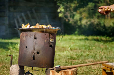 Smoking food at the stake. Smokehouse. Cooking in nature.