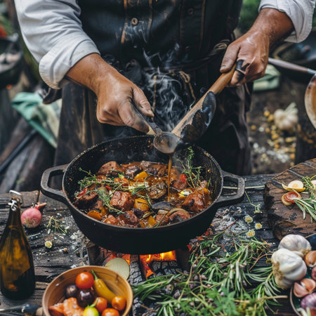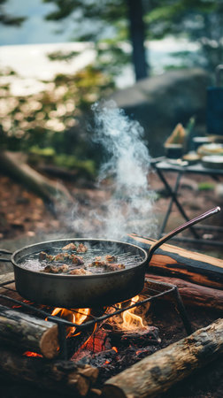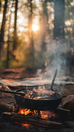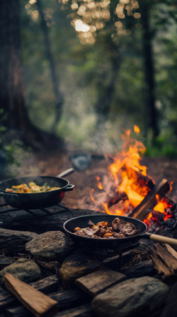 Professional chef skillfully prepares meal over open fire, surrounded by fresh ingredients in tranquil forest environment