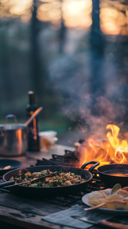 Outdoor Cooking With Fresh Ingredients at Sunset in a Forest