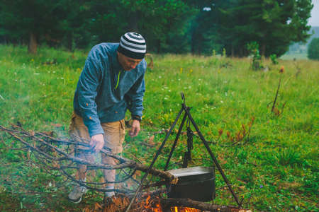 Tourist kindles fire. Traveler is lighting fire in camp. Man puts dry branch in campfire. Active outdoor recreation. Into the wild. Camping in dusk. Atmospheric warm in twilight. Active rest.
