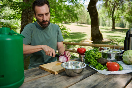 A man chopping vegetables, including an onion, while sitting outdoors in a natural park setting. Fresh ingredients like tomato and lettuce, and cooking tools are visible, enhancing the outdoor kitchen vibe.