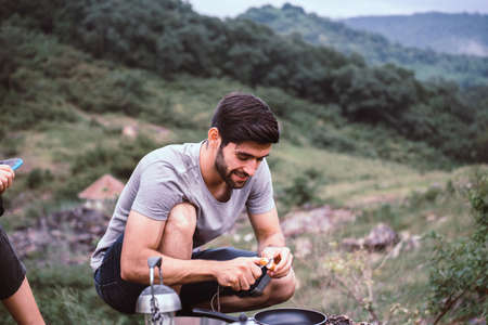 Young man cooking in snowy forest winter camp with tent survival and people concept
