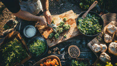An outdoor cooking scene with fresh vegetables and herbs being prepared on a rustic wooden table, highlighting the farm-to-table lifestyle and natural ingredients.