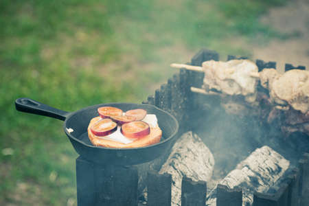 Cooking of fire in a fireplace. Frying a sandwich from bun, brie cheese and fresh sliced tomatoes. Selective focus on the food, blurred background.