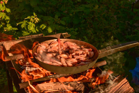 shrimp. Shrimps are cooked in a pan over a fire. Bonfire seafood. Food photography