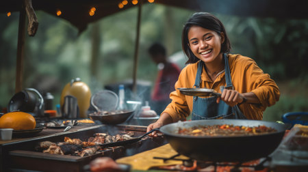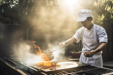Male Asian adult cooking outdoor kitchen stove. Generative AI AIG23.