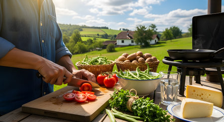 A man slices fresh tomatoes on a wooden board while cooking outdoors in a scenic countryside setting. Fresh vegetables, cheese, and a pan on a portable stove are visible, promoting a healthy, rustic lifestyle close to nature.