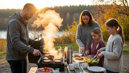 A happy family enjoys an outdoor barbecue party at sunset, with the father grilling burgers while the mother and two daughters prepare salads at a picnic table. The warm backlight and smoke create a cozy, joyful atmosphere of togetherness.