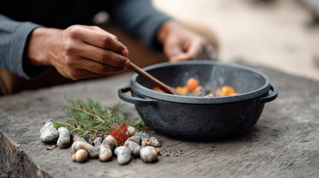 A close-up shot captures a weathered hand using a wooden spoon to stir a vibrant, steaming dish in a rustic stone pot over a crackling open fire, evoking a sense of traditional culinary heritage.
