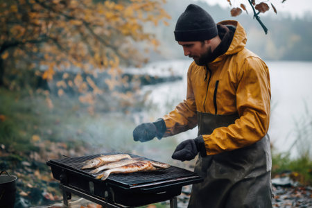 Fisherman wearing yellow raincoat and black beanie grilling freshly caught fish on a portable barbecue by the lake in autumn