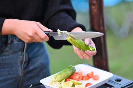 Photo of lady’s hands slices raw cucumber for cooking a papaya salad over the nature outdoors as a background. Cooking outdoors, Camping, Picnic concept.