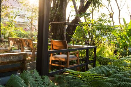 Relax chairs and table of patio to enjoy drinking cofee during sunset at coffee shop with spring garden. Drink on armchair seats with natural environment.
