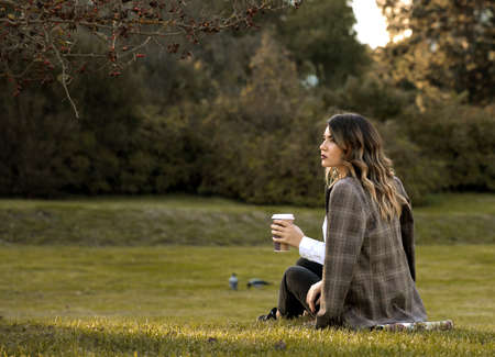 Beautiful young caucasian woman drinking takeaway coffee in park. Pretty girl with jacket outdoors with coffee cup.