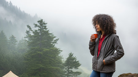 Pensive African American young woman hiker drinks coffee and enjoys the smell of the fresh morning forest alone. The breath of the morning foggy forest and the spirit of freedom.